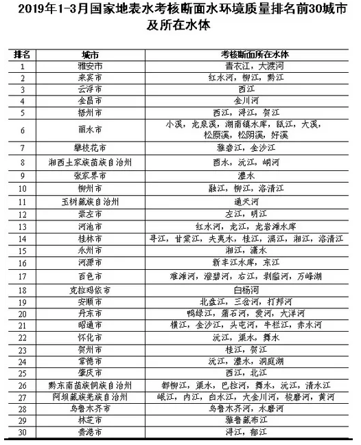 5月7日,这份榜单第一次公布。2019年一季度,全国地级及以上城市国家地表水考核断面水环境质量方面,雅安、来宾、云浮等30个城市的排名zui好,吕梁、营口、邢台等30个城市则排名zui后。排名前30的城市中,广西有来宾、梧州、百色、贵港、桂林、河池、崇左、柳州、贵港等9个城市上榜,可以说广西是全国水质较好的省份。