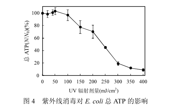 磷酸腺苷(ATP)是微生物代谢活动的主要能源,因此 ATP的浓度能近似的反应微生物的活性和新陈代谢能力。该研究进一步探索了紫外线消毒过程对大肠杆菌总ATP含量的影响,结果如图4所示.在低紫外剂量下(<100mJ/cm 2 ),紫外线对大肠杆菌ATP含量无明显影响,有轻微的增加趋势.随紫外线剂量进一步增加(>100mJ/cm 2 ) ATP 含量呈下降趋势,大肠杆菌丢失其代谢能力。